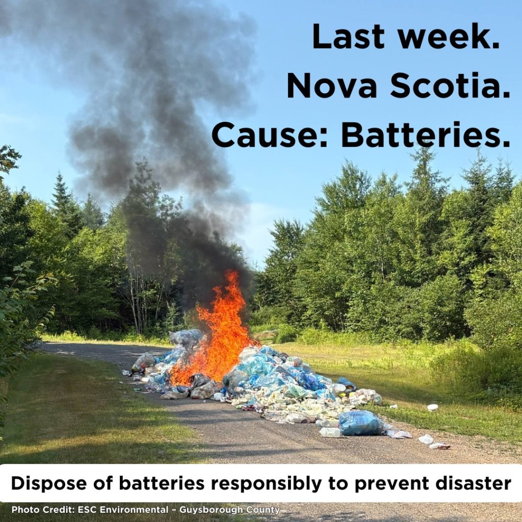 The photo we are sharing is from an actual fire caused in the Municipality of Guysborough in late July – and we have been advised that there was a fire at a transfer station in Kentville yesterday believed to be caused by a damaged lithium battery. Fortunately, it was contained to a trailer and was extinguished safely before it could spread.