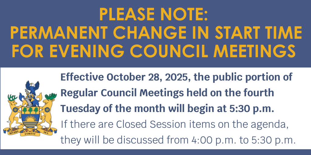 Effective Tuesday, October 28, 2025, the public portion of Regular Council meetings held on the fourth Tuesday of the month will begin at 5:30 p.m. If there are Closed Session items on the agenda, they will be discussed from 4 p.m. to 5:30 p.m., before the public session begins.