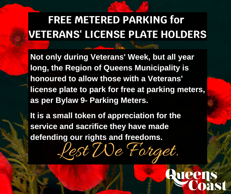 Not only during Veterans’ Week, but all year long, the Region of Queens Municipality is honoured to allow those with a Veterans’ license plate to park for free at parking meters, as per Bylaw 9- Parking Meters.