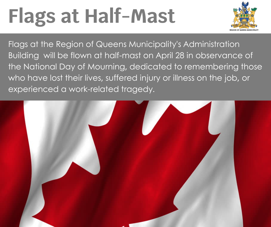Flags at the Region of Queens Municipality’s Administration Building will be flown at half-mast on April 28 in observance of the National Day of Mourning, dedicated to remembering those who have lost their lives, suffered injury or illness on the job, or experienced a work-related tragedy.
