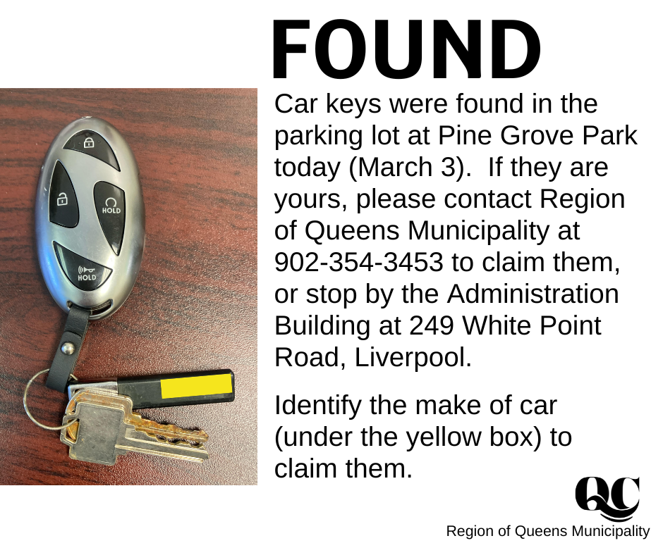 A key fob for a car and other keys was found in the parking lot at Pine Grove Park today (March 3). If this is yours, please contact Region of Queens Municipality at 902-354-3453 to claim them, or stop by the Administration Building at 249 White Point Road, Liverpool.