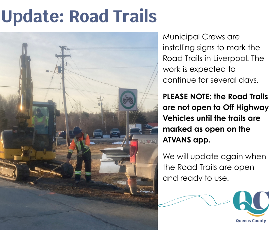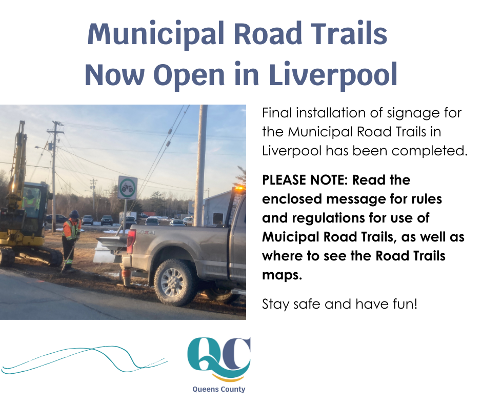 Road trails in Liverpool will follow the Road Trail Act as indicated in Region of Queens Municipality’s Bylaw 28: https://www.regionofqueens.com/…/route%3A/download/4313/ To review the Province of Nova Scotia’s Road Trails Act which includes rules, operating equipment, expectations, and current provincial road trails, please go to the following website: https://novascotia.ca/road-trails-act-overview/