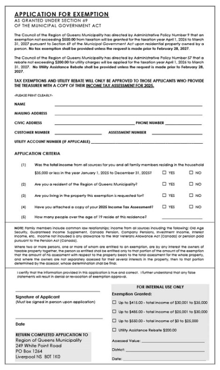 The Tax Exemption Program provides support in the form of a residential property tax exemption up to $550 in value in the 2026/2027 tax year for qualified applicants.